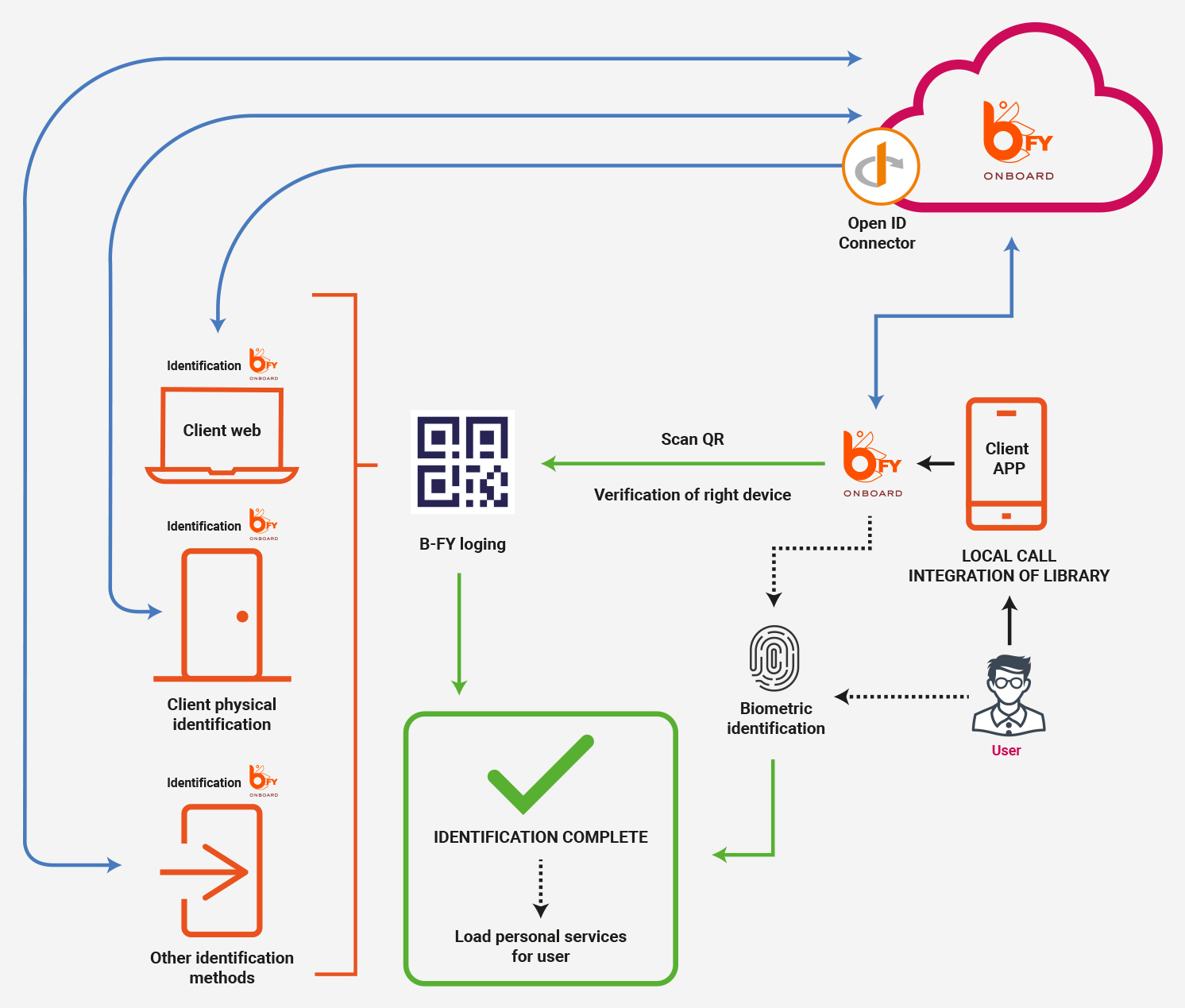 Unifica el log-in a tus servicios en todos los canales donde ofreces tus servicios. B-FY en tu sistema hará que tu APP sea la llave de entrada de tus usuarios. Integrando B-FY de manera sencilla en tu sistema, tus usuarios accederán a todos los servicios (web, de acceso físico, identificación desatendida, etc.), del mismo modo, simple, seguro y sencillo.
