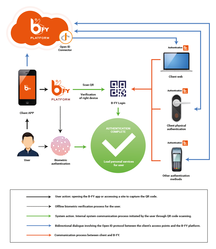 B-FY Platform offers a well-documented API/OpenID that allows companies to quickly integrate its authentication technology into their platforms (web, mobile, or physical access points).